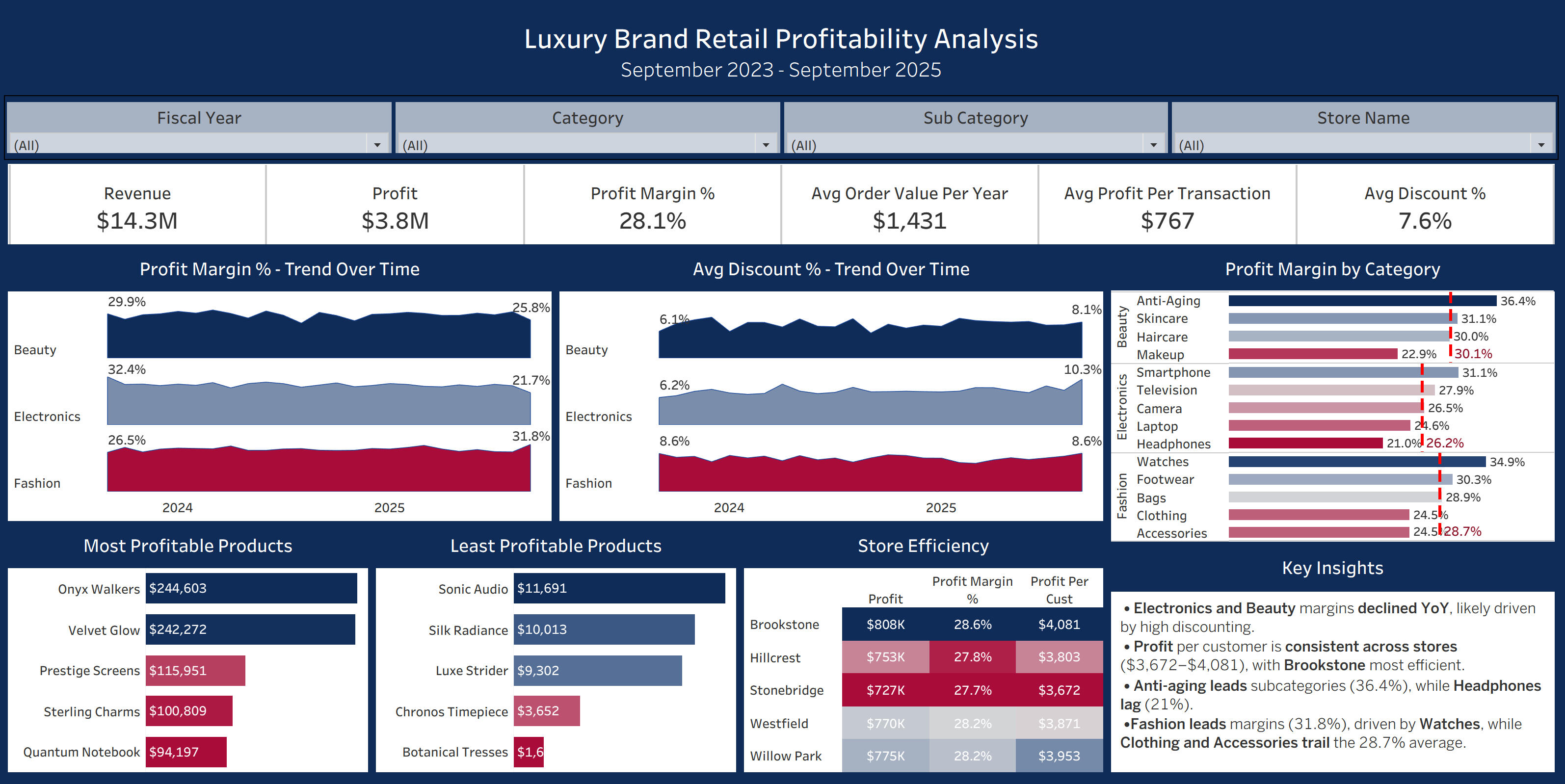 A Tableau dashboard analyzing luxury retail data across categories, stores, and products to uncover profitability trends and margin drivers.