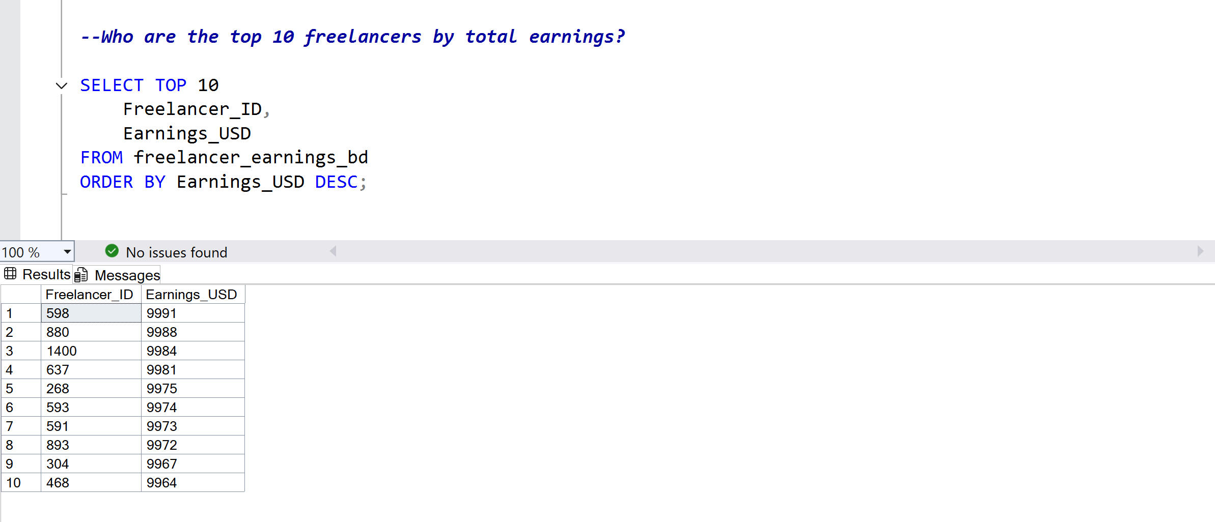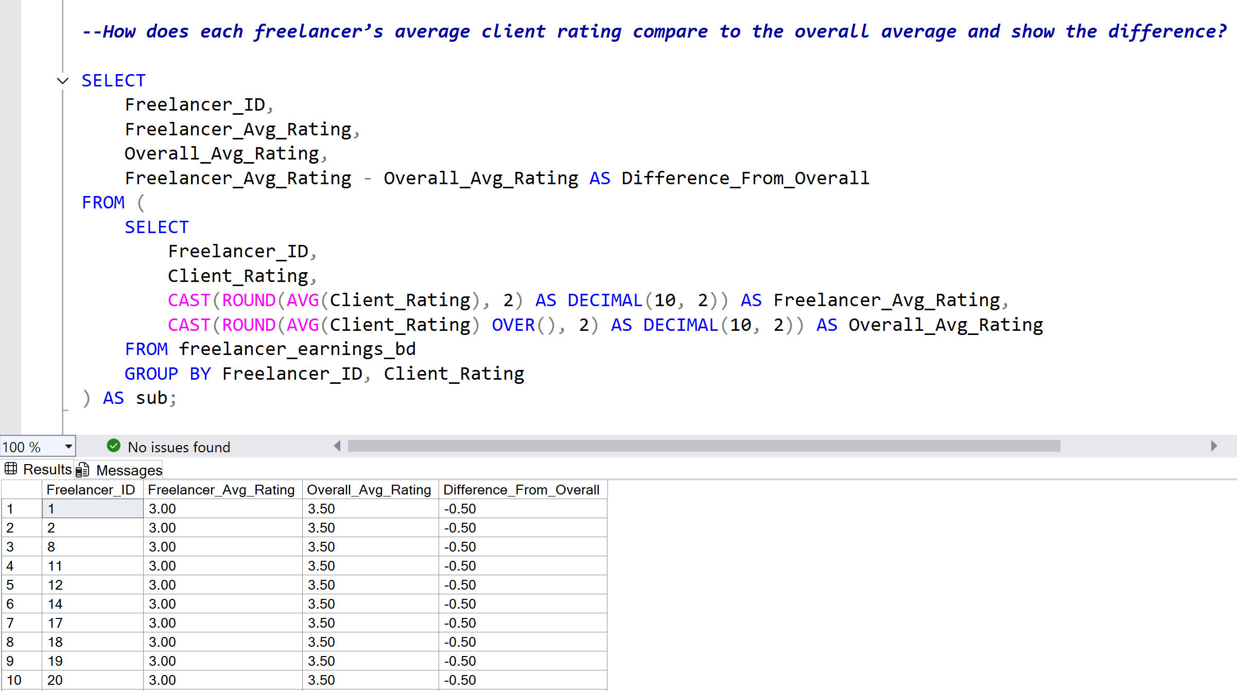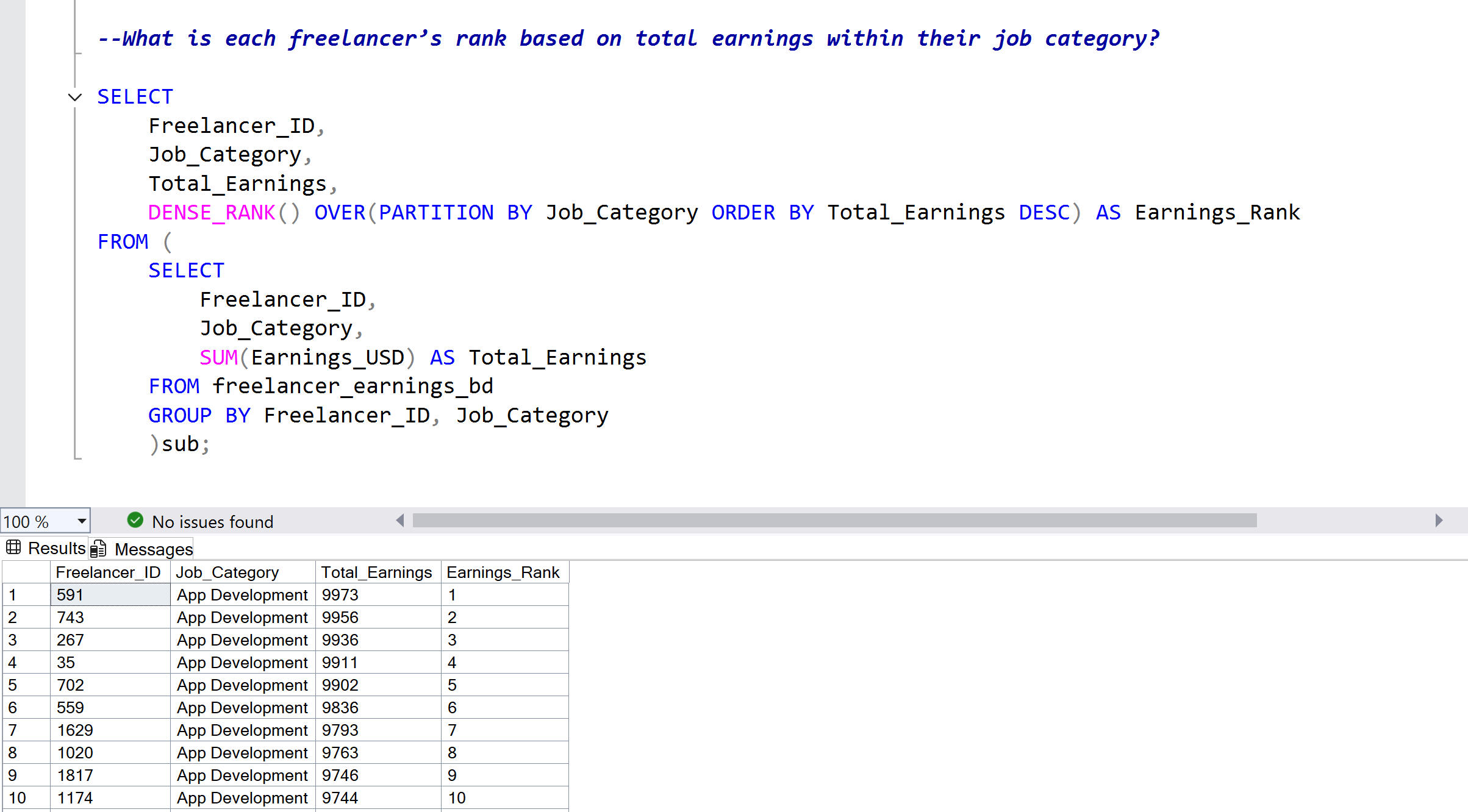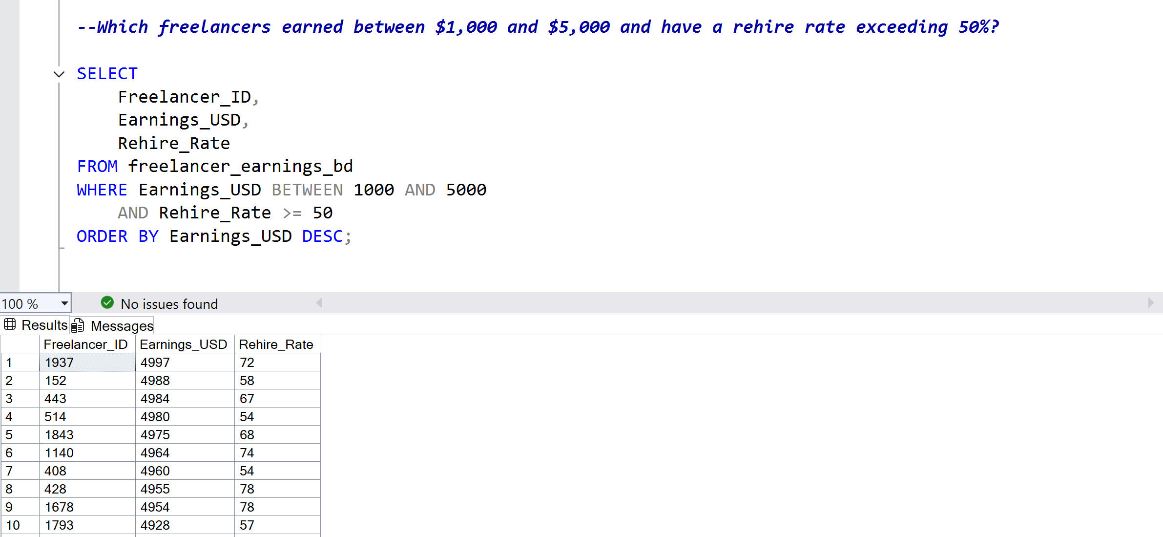Real business questions applied to freelancer data, demonstrating SQL queries from basic to advanced with documented results for each.