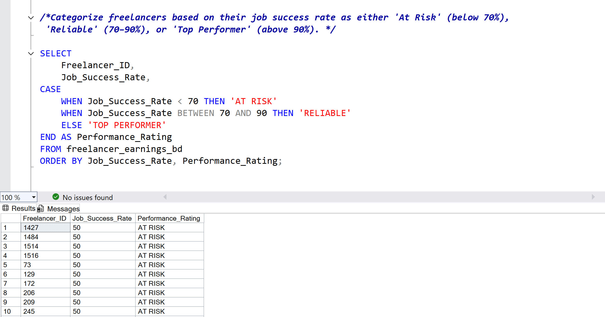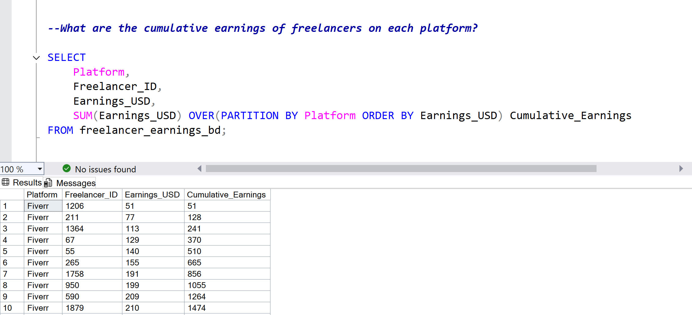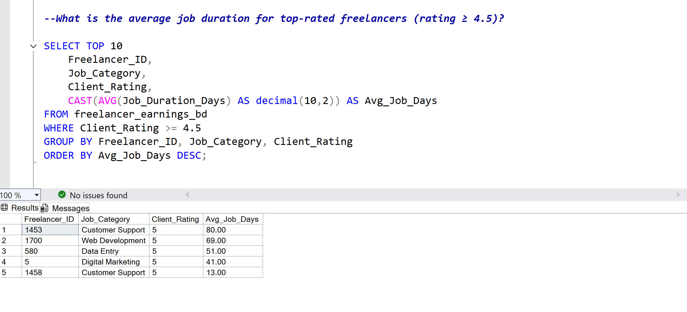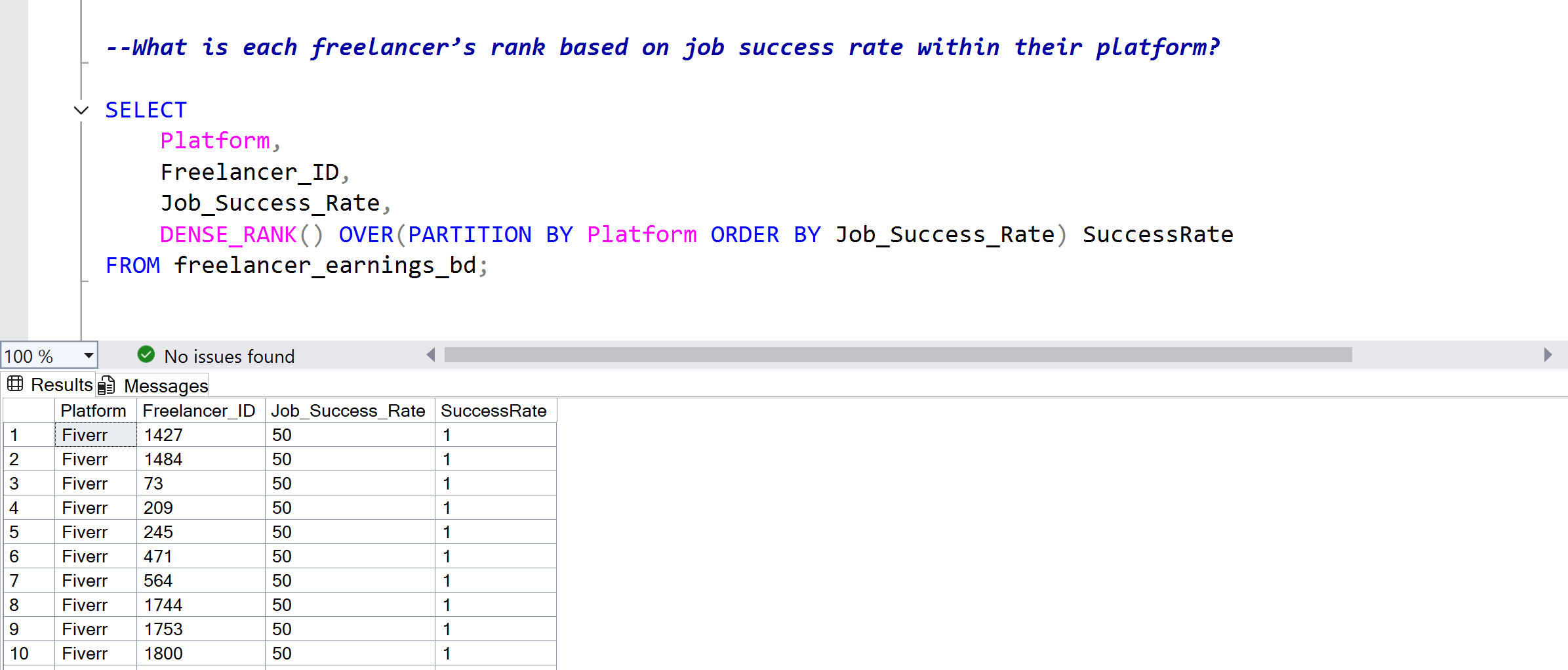 Real business questions applied to freelancer data, demonstrating SQL queries from basic to advanced with documented results for each.