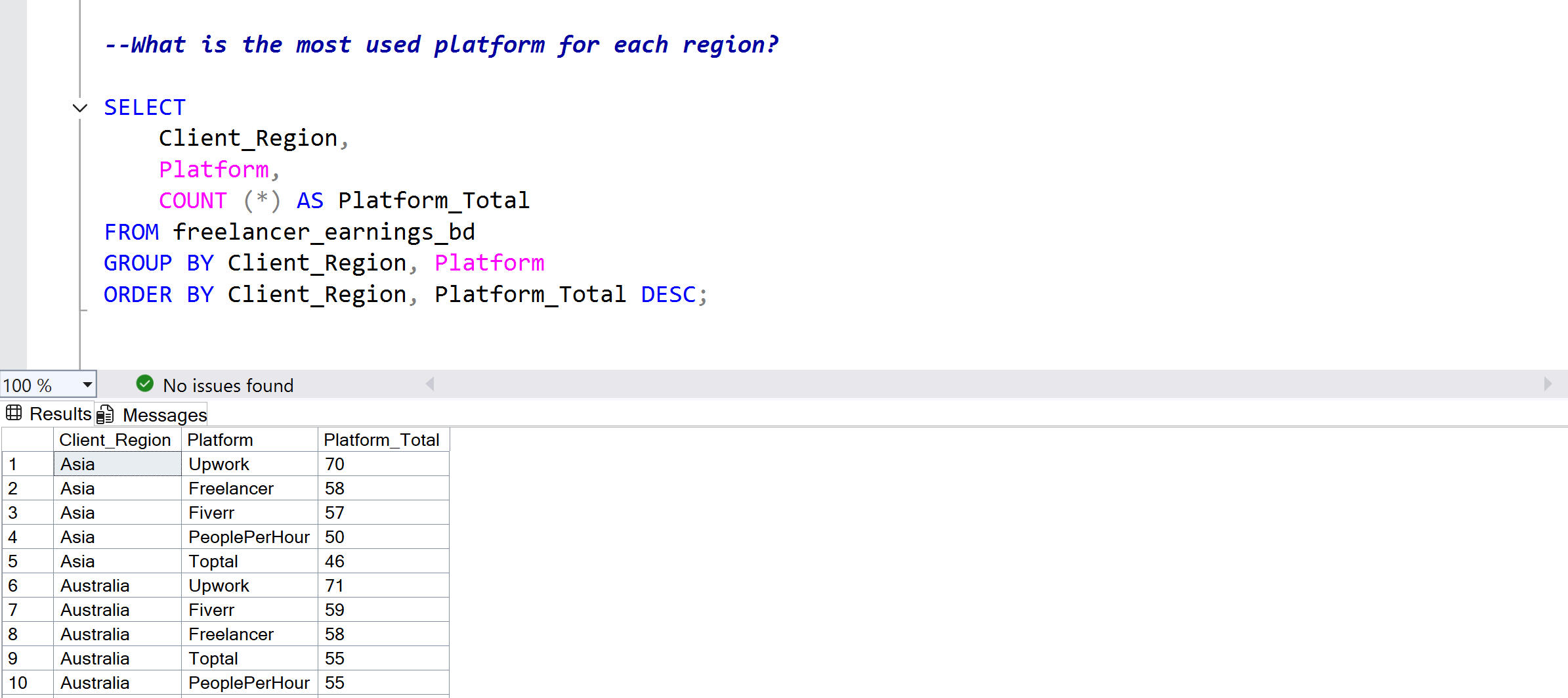 This project demonstrates my SQL skills through an analysis of freelancer industry trends. I've structured the analysis around real-world business questions, from basic data exploration to advanced analytical techniques. Each query is presented alongside its results to show the technical approach and the insights uncovered.